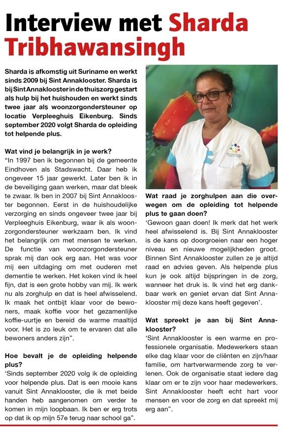 Sharda is afkomstig uit Suriname en werkt sinds 2009 bij Sint Annaklooster. Sharda is bij Sint Annaklooster in de thuiszorg gestart als hulp bij het huishouden en werkt sinds twee jaar als woonzorgondersteuner op locatie Verpleeghuis Eikenburg. Sinds september 2020 volgt Sharda de opleiding tot helpende plus.